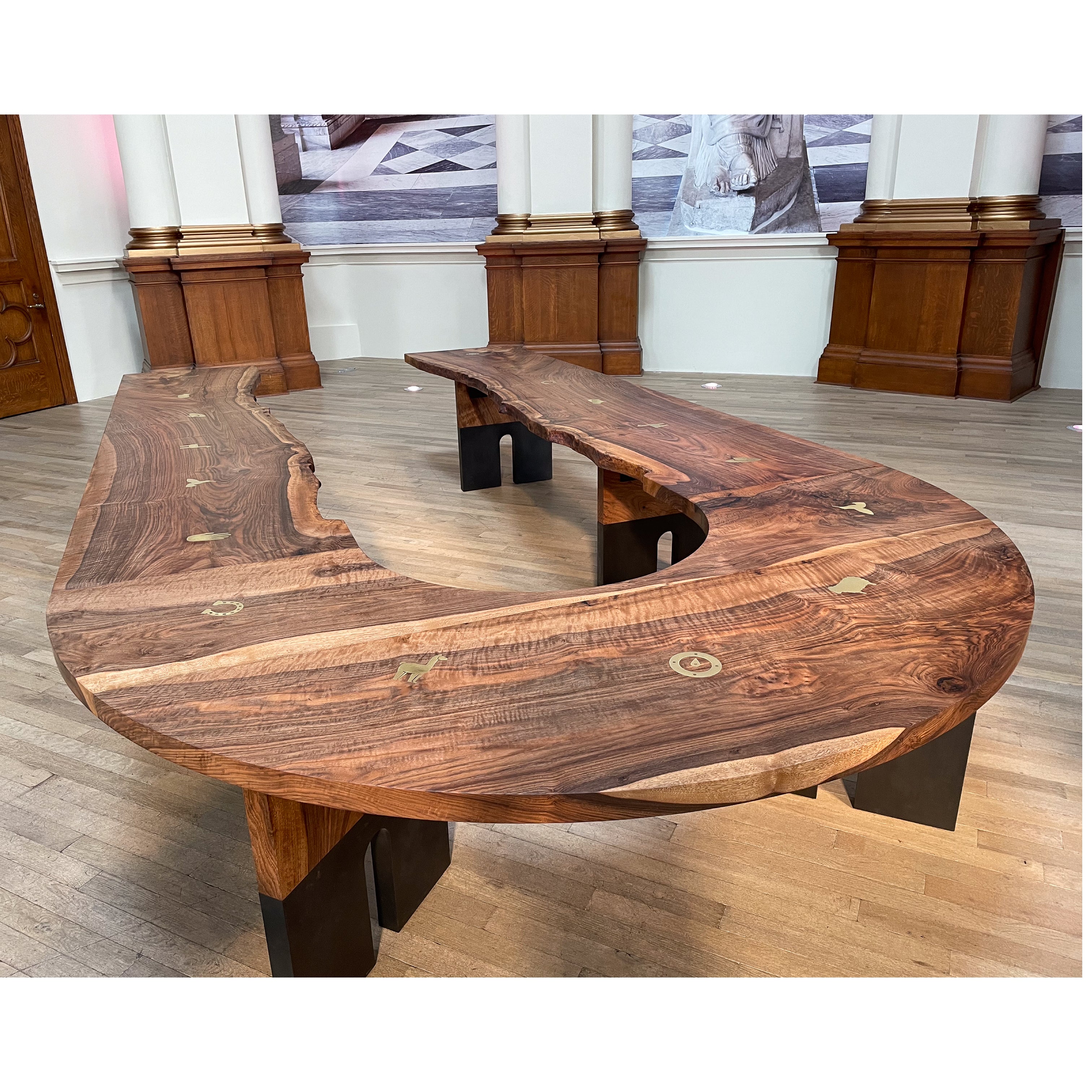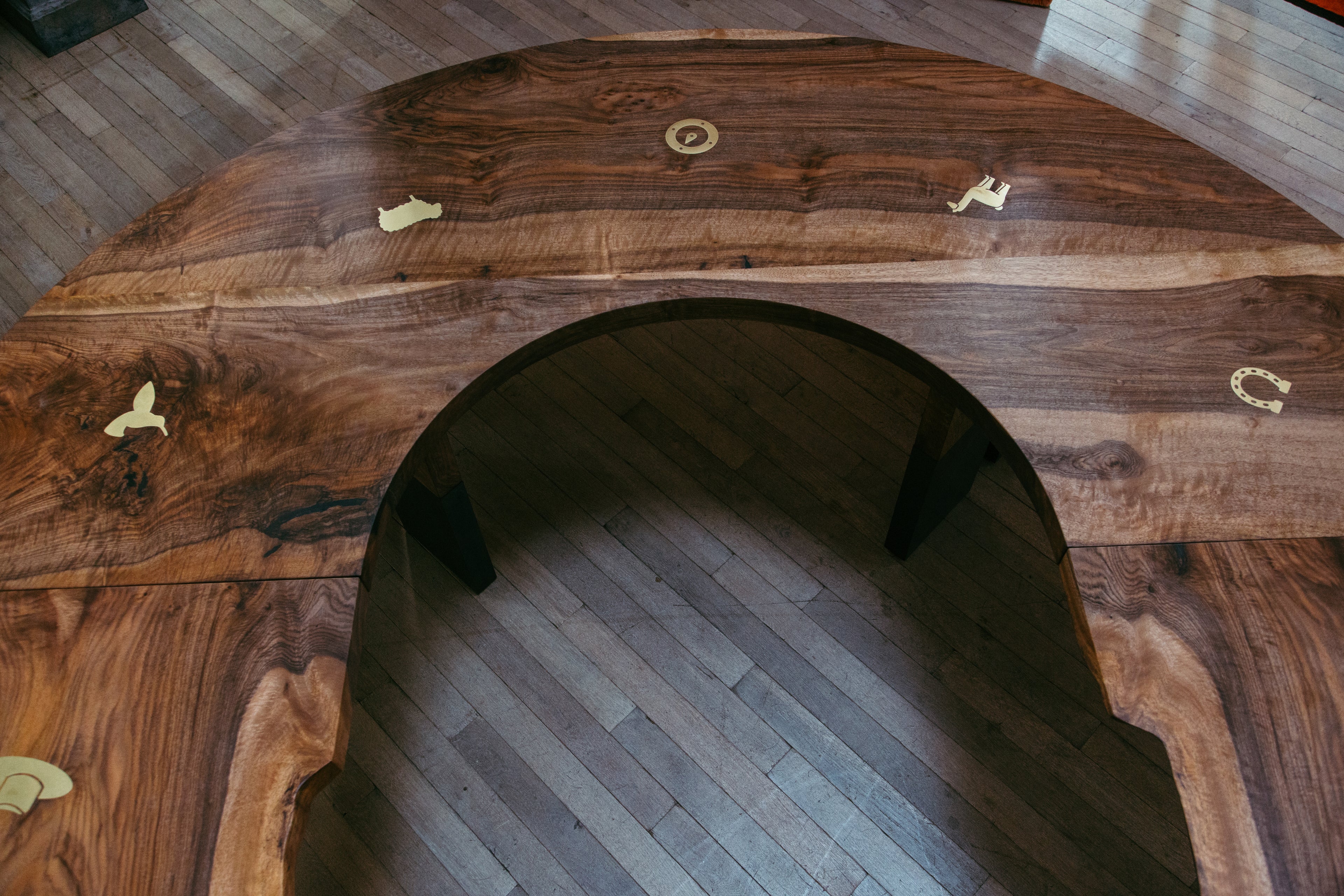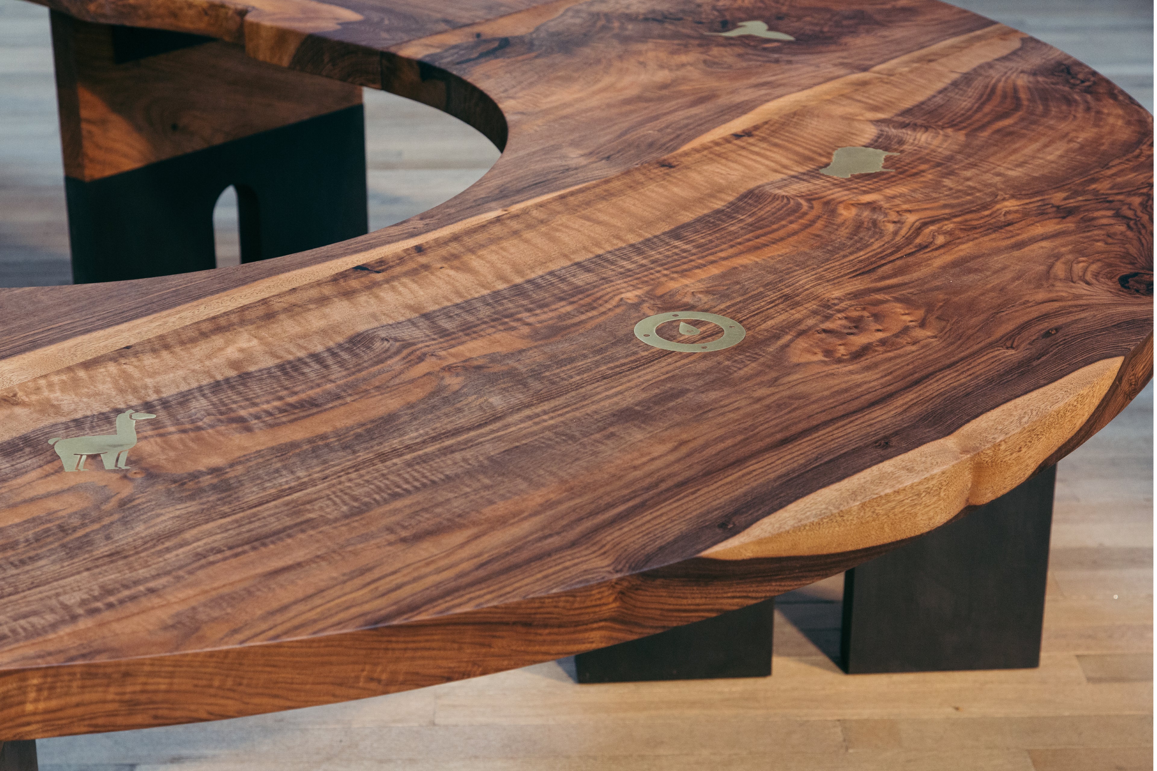 The brass symbols were selected to follow the ranch themed art direction of the client site where the table now lives. The animals chosen all live on site. The hand is my signature on the piece, and the compass points to the sun