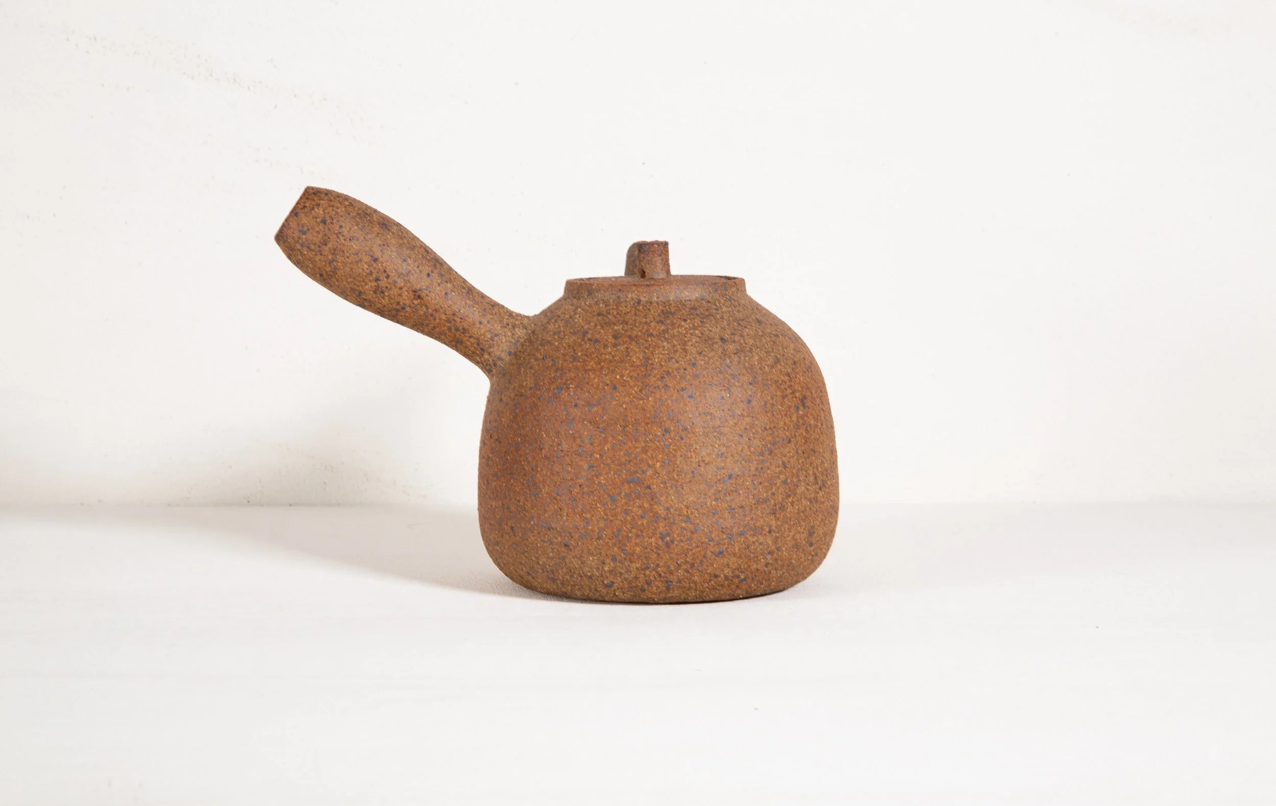 I threw this side-handle teapot on the wheel using a speckled stoneware claybody that I’ve been working with for the last 20 years. I fired it to cone 11 in a reduction atmosphere, allowing the oxygen-depleted flame to interact with the minerals in the surfaces of the pots to create subtle shifts in tone and texture. Each surface holds a quiet record of this process—organic and unpredictable—bringing a subtle wabi-sabi element into the tea ceremony. Inside the pot, I left the clay unglazed so it will develop a patina over years of steeping, deepening the connection between the vessel and your tea practice.